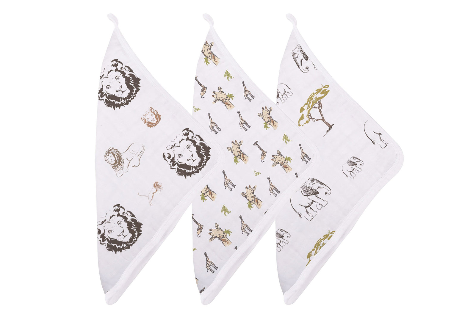 On The Savannah Washcloth Set 3pk. Our generously sized bamboo washcloths are a bath time essential. Featuring an attached loop for quick drying and colorful prints for bath time fun.